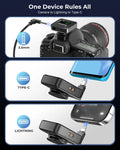 • UNIVERSAL COMPATIBILITY: The receiver comes with interchangeable Lightning, USB-C and 3.5mm (camera) ports for 99% of modern devices. Just plug it into your iPhone, Android phone, DSLR or laptop – no adapter needed. It’s essentially an all-in-one wireless microphone for YouTubers and content creators, ensuring seamless setup across smartphones, cameras and PCs so you can start recording instantly.